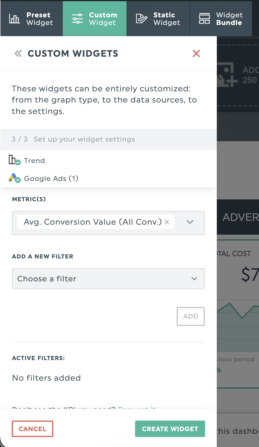 Make your own widgets based on the data you want to visualize! Use them to turn platform data into tailored views of key metrics, such as a trend widget that tracks changes in your average conversion value from Google Ads for deeper analysis.