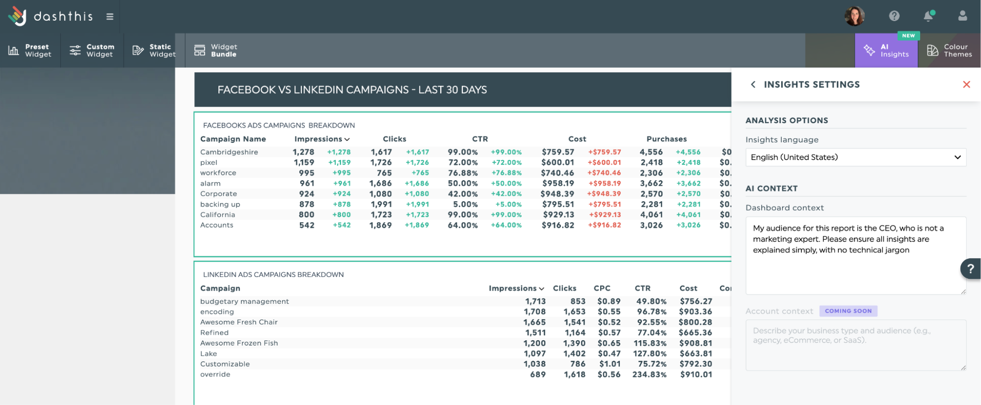 DashThis’s AI tailors insights in your dashboard to your specific needs. With AI Insights Pro, you can describe your audience and what they care about, and that information shapes the analysis. This helps produce clear takeaways for non-technical readers.