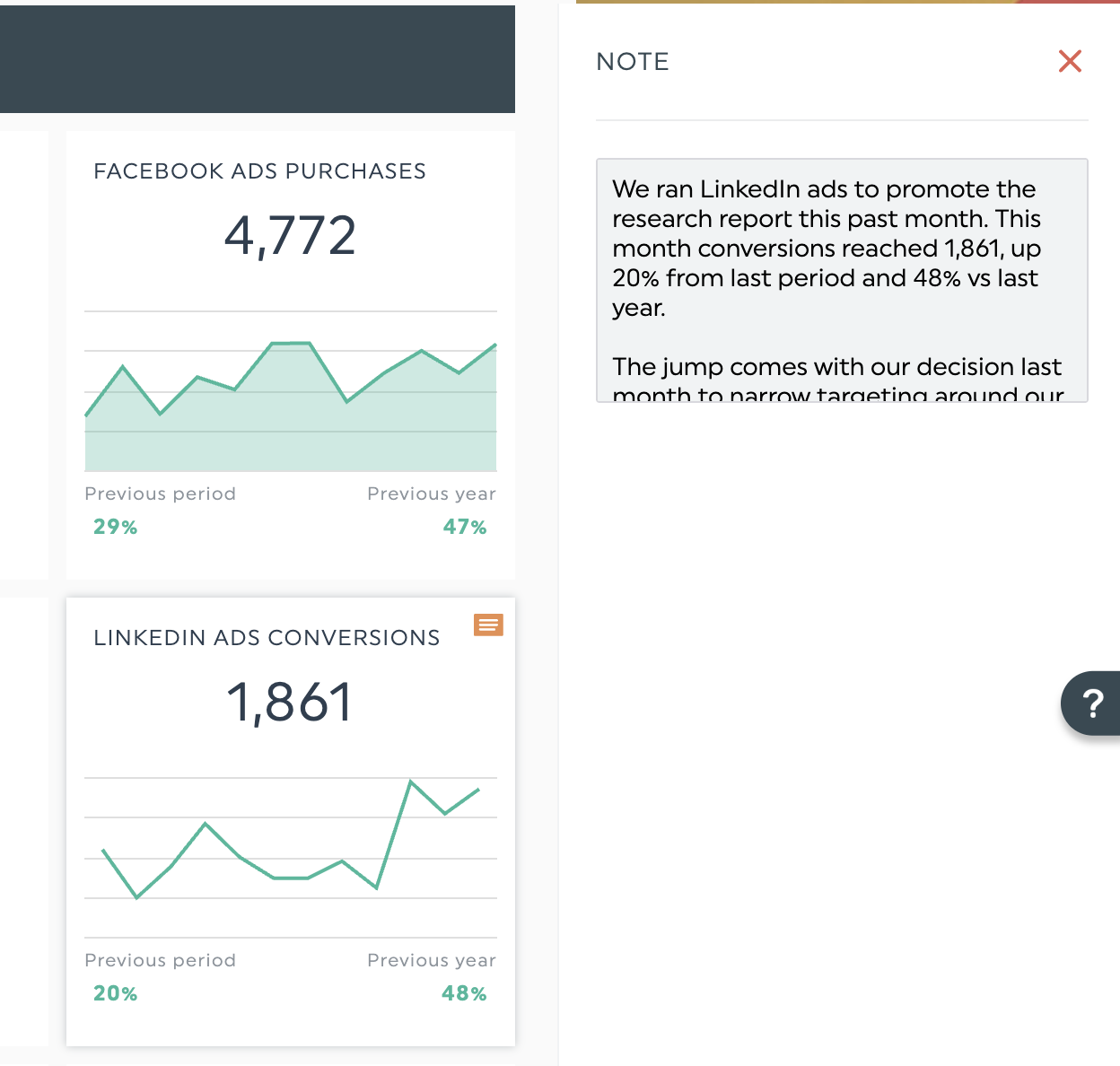 Adding explanations can clutter a report. DashThis’s notes and comments let you add context to specific metrics or sections of a report without introducing visual noise. For example, you can explain a jump in conversions in a comment like this.